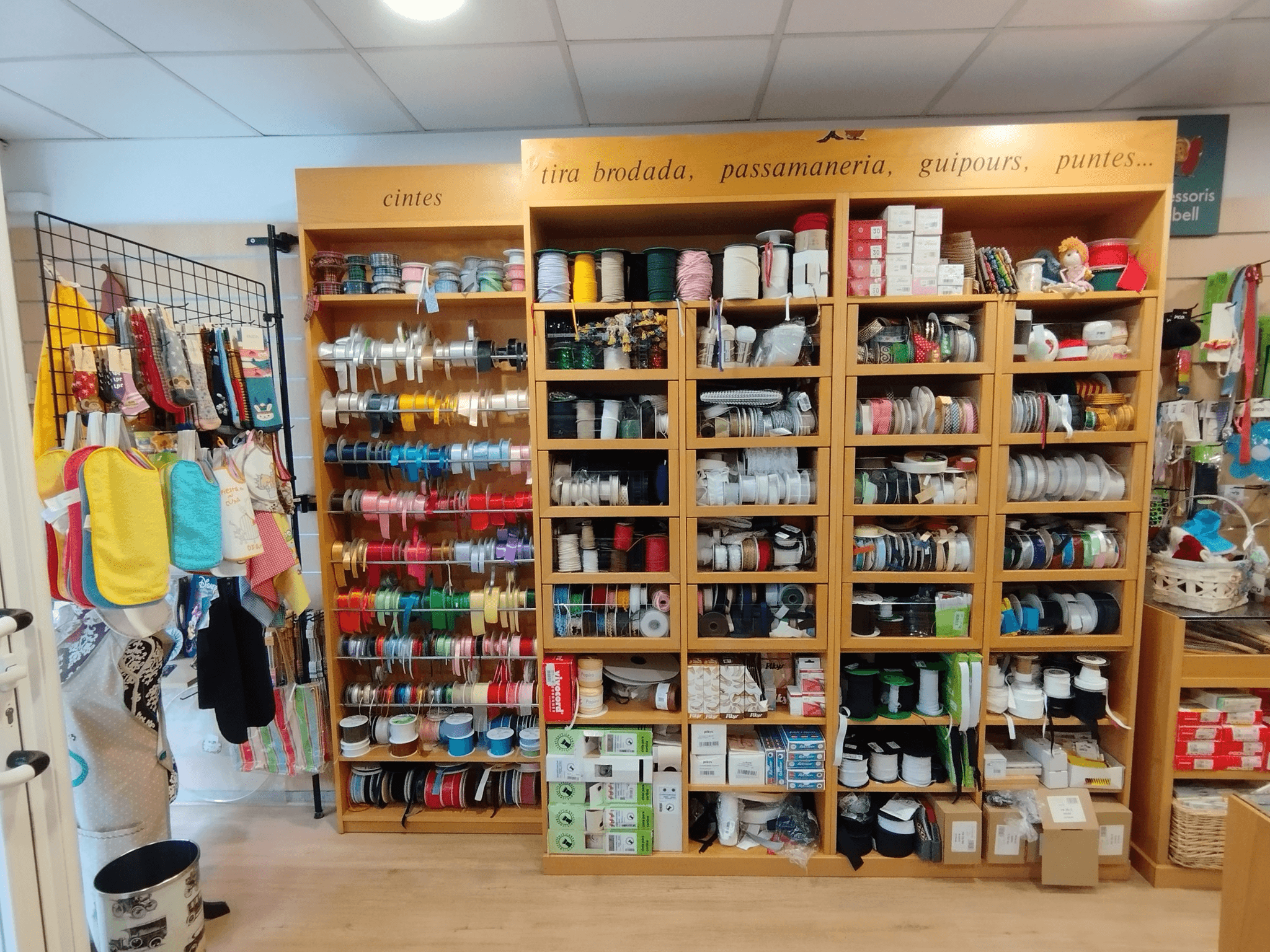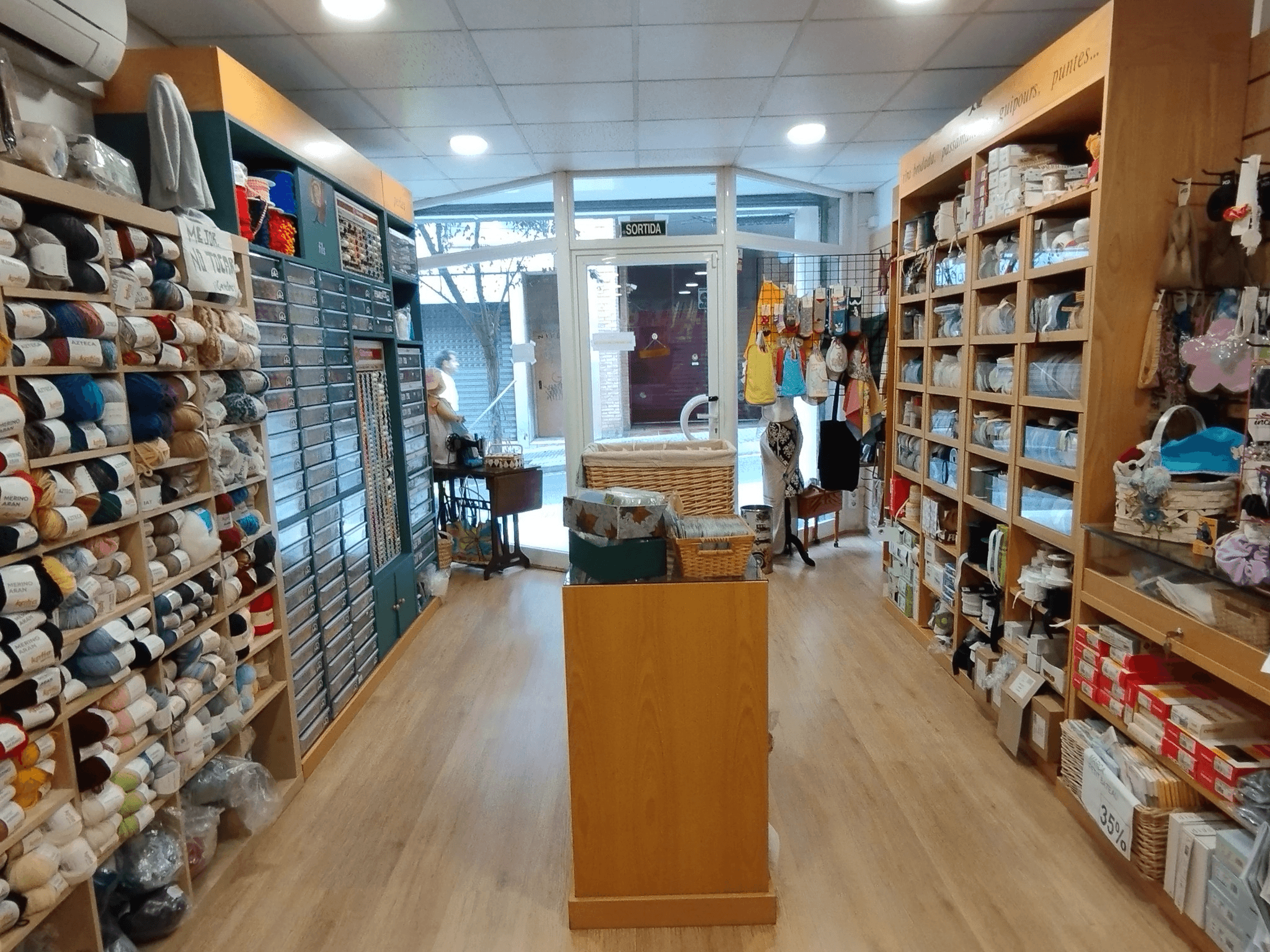 • 2 grandes estanterías de lanas + 4 estanterías de telas + expositores de cremalleras, hilos y bisutería.